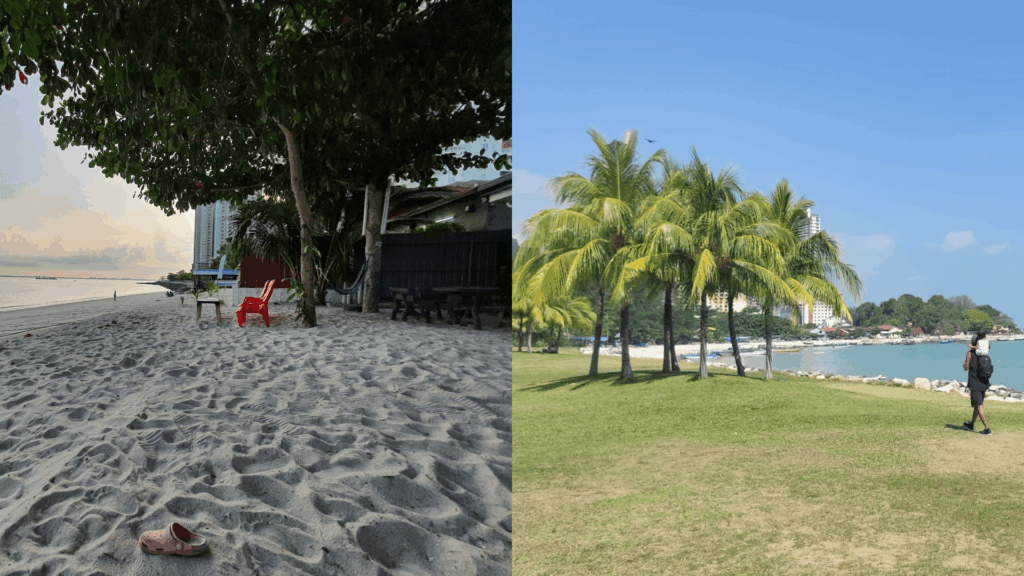 The beach features golden sand and calm waters bordered by palm trees and modern high-rises. It offers a more relaxed, less commercial environment compared with Penang’s main tourist beaches. Visitors come for leisure walks, sunbathing, or sunset views along the gently curving coastline.