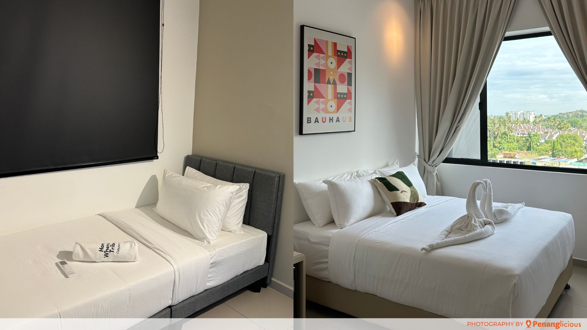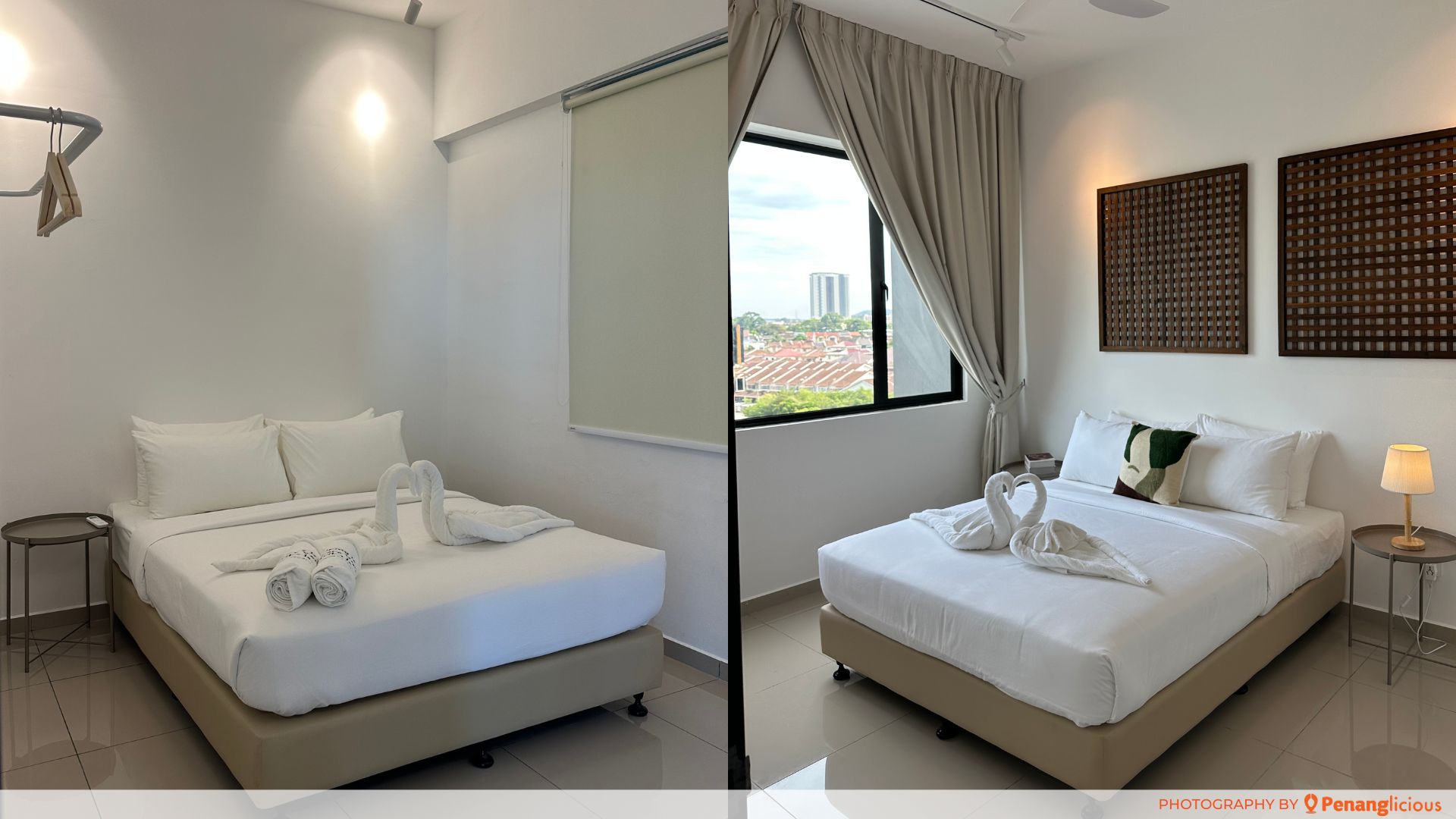 The third room (left) is part of Coby’s Cove, a 3-bedroom apartment that accommodates up to 6 people. It features a minimalist design with essential furnishings, making it a peaceful and functional space. On the right is Coby’s Capsule, a separate studio unit that holds up to 2 people. The studio offers a more intimate setting, ideal for solo travellers or couples, with large windows providing a stunning view, combining comfort and a modern aesthetic. Both spaces cater to different guest needs while ensuring a clean and serene environment.